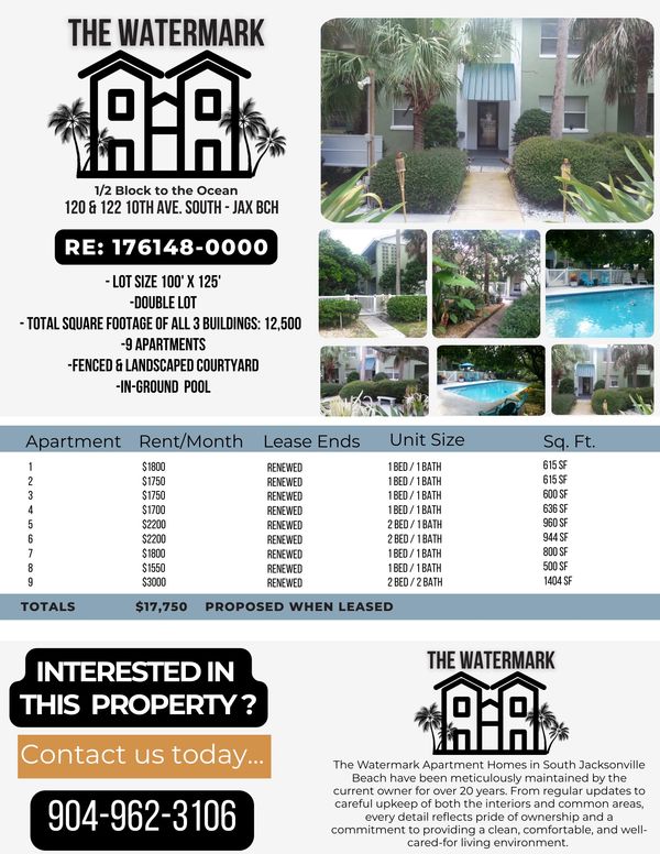 The Watermark Apartment Homes in South Jacksonville Beach have been meticulously maintained by the current owner for over 20 years. Review the rental information above and let me know if you're interested. Just like Ocean Suites Apartments, the Watermark is in fantastic condition and offers a great pool and beautiful common areas. Interested? Let's talk about the Watermark!