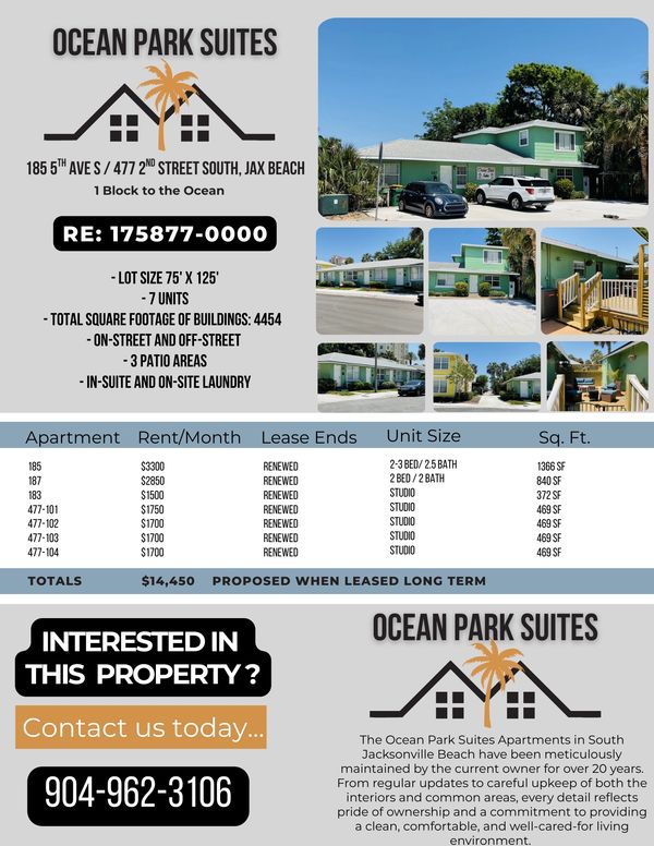 The Ocean Park Suites Apartments in South Jacksonville Beach have been meticulously maintained by the current owner for over 20 years. From regular updates to careful upkeep of both the interior and common areas, every detail reflects pride of ownership and a commitment to maintaining a beautiful rental option for tenants in Jacksonville Beach! Interested? Let's set up a time for you to have a private showing.